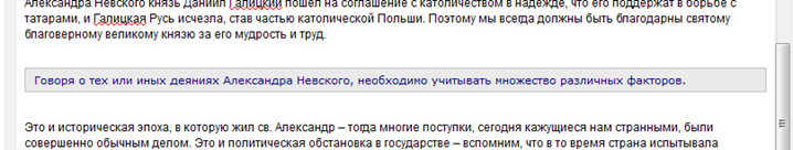 Оформление текста в виде Подзаголовка. Это клавиша, следующая после цитаты. Когда вы выделите текст в режиме вв-код и нажмете на эту кнопку, он будет выглядеть так: [CODE] Говоря о тех или иных деяниях Александра Невского, необходимо учитывать множество различных факторов.[/CODE] А в готовом виде Подзаголовок будет иметь такой вид (текст выделен другим цветом и взят в рамочку):