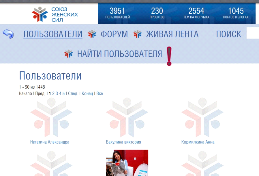 Список всех пользователей можно посмотреть по ссылке http://союзженскихсил.рф/people/ Так же пользователя можно легко найти по Имени Фамилии. Для этого нажимаем НАЙТИ ПОЛЬЗОВАТЕЛЯ, а затем в новом окне вписывает его данный и нажимаем «найти».