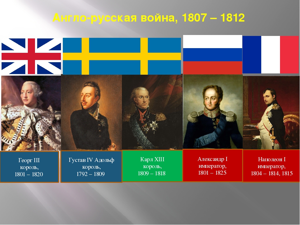 Знакомьтесь, дамы и господа! Это действующие лица той войны. о которой знает не каждый специалист в истории России. Именно эти правители были, косвенно или прямо, были причастны к вооружённый конфликт между Российской и Британской империями разразившемуся в период Наполеоновских войн. Собственно он и был частью этих войн, родившись из поражения Российской империи в битве под Аустерлицем. Вынужденный начать мирные переговоры, Александр 1 на встрече в Тильзите (25 июня 1807 года) сказал французскому имп...