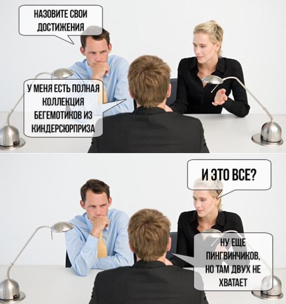 1. Почему вы выбрали именно нашу компанию? Вы идиот? Я направил резюме в десяток мест. Где устроюсь быстрее и выгоднее – там и хорошо. 2. Как вы считаете, почему мы должны выбрать именно вас? Вам работники вообще нужны? Ну вот он я. Работник. Именно меня стоит выбрать хотя бы потому, что я явно умнее всех тех, кто заливал на эти вопросы стандартную чушь. И умнее вас, между прочим, потому что я никогда таких дурацких вопросов бы не задал. 3. Какую зарплату вы хотели бы получать? 2,5 млн. $ в год, как пр...
