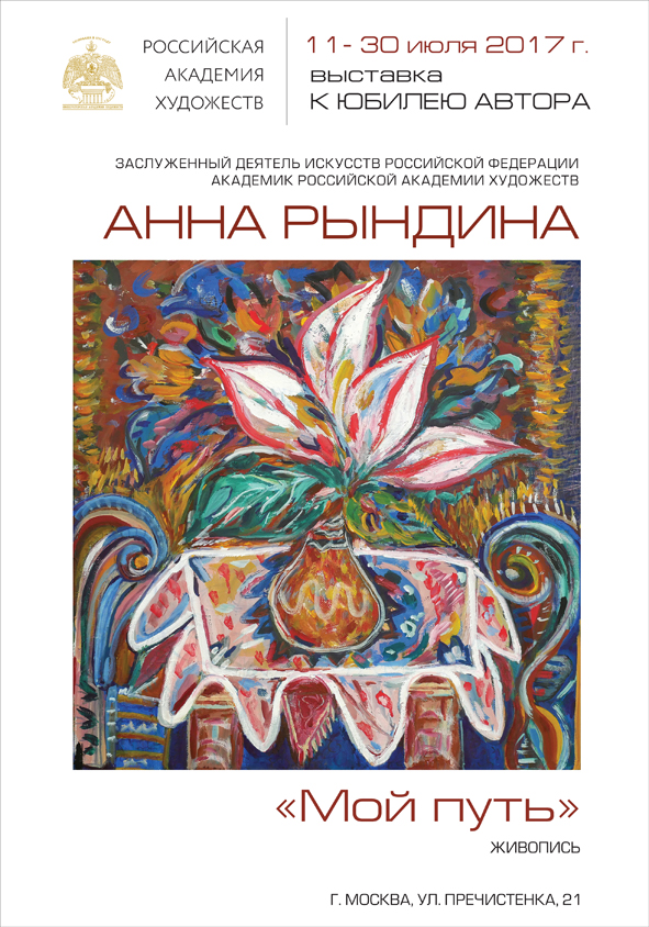 11 июля 2017 г. в 16 часов в залах Российской академии художеств по адресу: улица Пречистенка, 21 открывается выставка произведений Заслуженного деятеля искусств РФ, доктора искусствоведения, профессора, академика Российской академии художеств Анны Вадимовны Рындиной «Мой путь». Выставка живописи приурочена к юбилею автора.В экспозиции представлено около 70 произведений. Среди них – графические эскизы костюмов и декораций к спектаклям 1960-х – 80-х годов и живописные произведения в технике гуаши, темперы ...