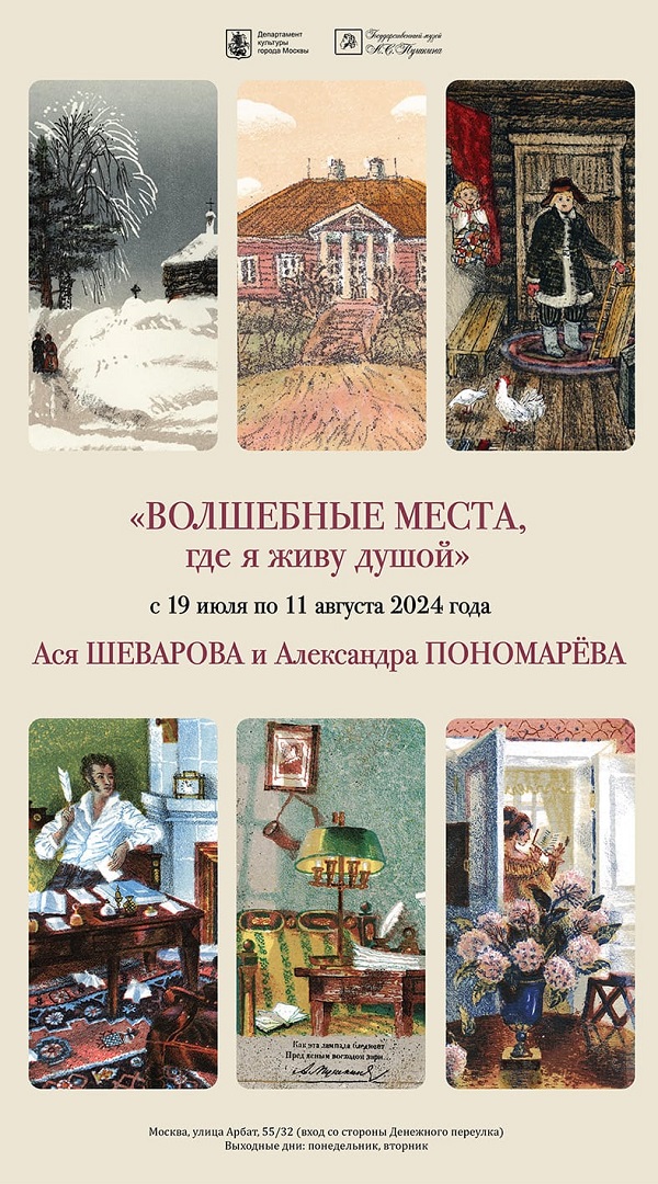 В Выставочных залах Государственного музея А.С. Пушкина на Арбате открылась выставка работ Александры Пономаревой и Аси Шеваровой “Волшебные места, где я живу душой”. Это творческий отчет молодых художников об их поездках по пушкинским местам: Михайловскому, Тригорскому, Петровскому, Болдину, Гурзуфу. Пономарева и Шеварова с кистью и мольбертом побывали в заповедных уголках России, воспетых в стихах гениального поэта.