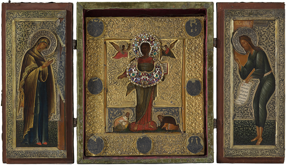Икона в окладе "Спас Смоленский" в киоте-складне. XVII век. Третьяковская галерея
