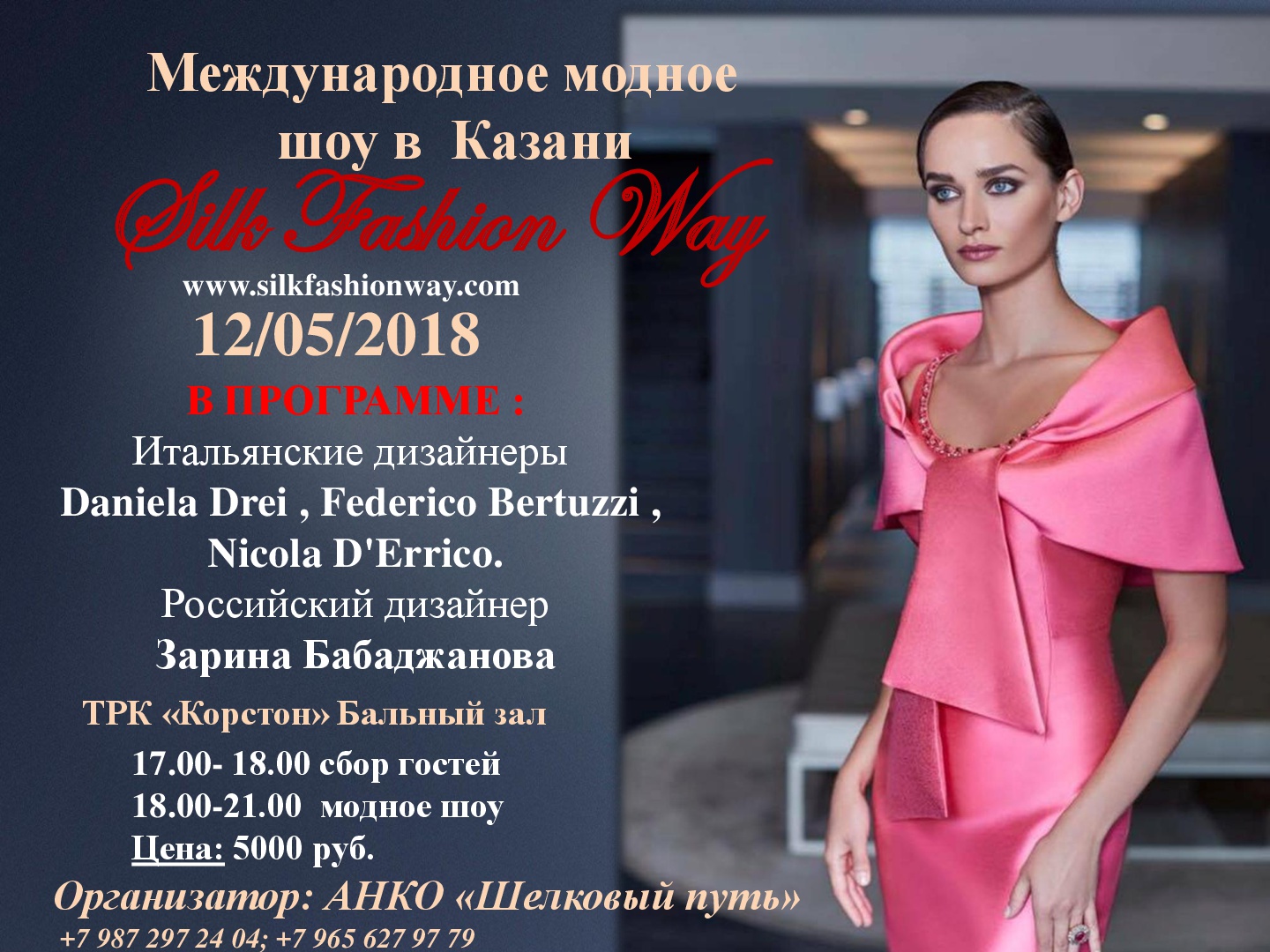 В 12 мая в Казани в ТРК «Корстон» при поддержке Торгово-промышленной палаты Республики Татарстан в г.Казань состоится фееричное и красочное Международное Модное шоу «Silk Fashion Way».