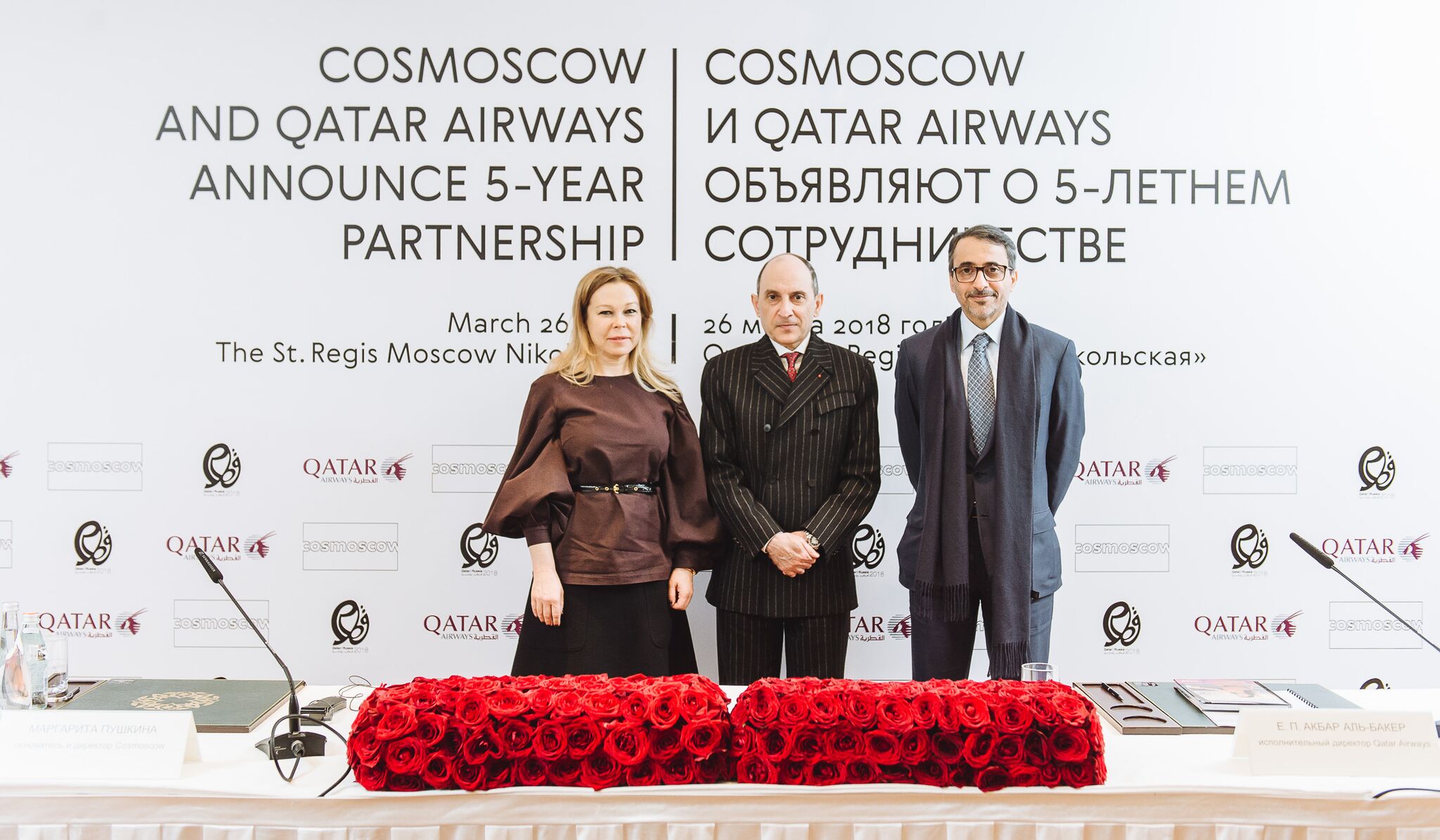 Международная ярмарка современного искусства Cosmoscow и Qatar Airways объявляют о начале 5-летнего партнерства в рамках перекрестного Года культуры России и Государства Катар. В качестве генерального партнера Cosmoscow авиакомпания Qatar Airways будет представлена на основной площадке ярмарки в Гостином Дворе с 6 по 9 сентября 2018 года, а также будет иметь возможность принять участие в ряде программ и проектов Cosmoscow. Меморандум о намерениях между Cosmoscow и Qatar Airways был подписан в отеле «St. Re...