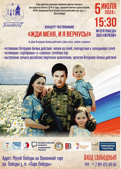 Концерт под таким названием, приуроченный ко Дню Ветеранов боевых действий и Дню семьи, любви и верности состоится 5 июля 2024 года в Музее Победы на Поклонной горе.