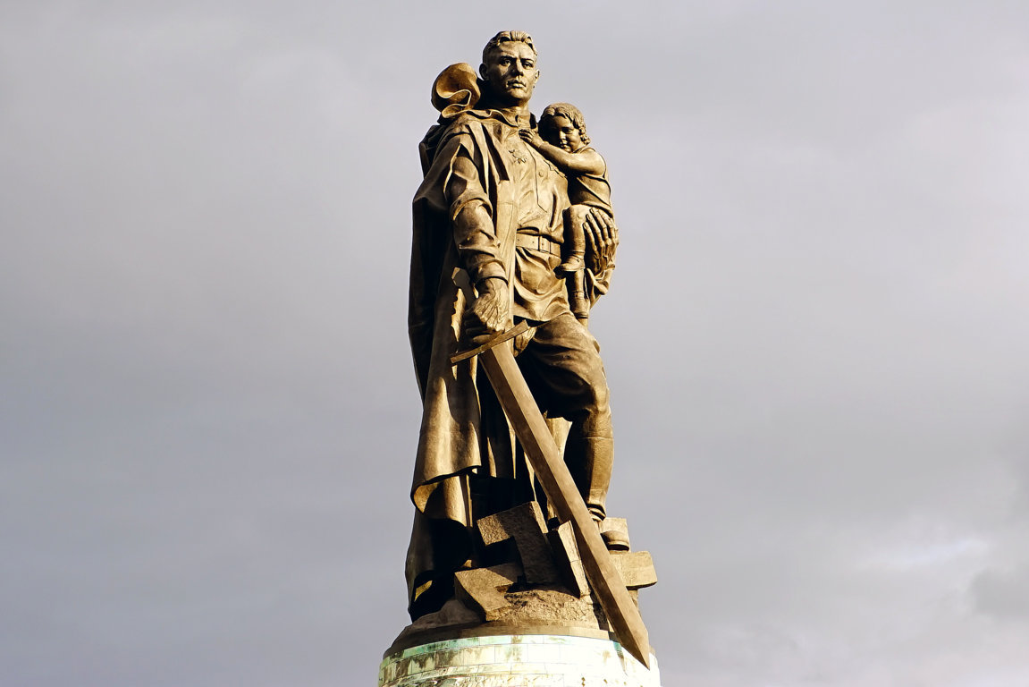 Один из самых знаменитых в мире памятников советскому солдату был открыт 8 мая 1949 года в берлинском Трептов-парке. Собственно, там был создан целый мемориальный комплекс, но героическая фигура воина, попирающего разломанную свастику и держащего в одной руке меч, а в другой спасенную немецкую девочку – это ось композиции. И в скульптурном смысле, и, тем паче, в идеологическом.