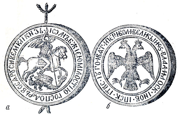 В 1480 г. Северо-Восточная Русь освободилась от власти Орды, а Московское государство стало независимым, самодержавным. Иван III стремился превратить Москву в «третий Рим» взамен утратившего свое значение Константинополя (Царьграда). С конца XV в. на печатях московского государя появляется византийский двуглавый орел, который сочетается с прежним гербом - изображением Георгия ...