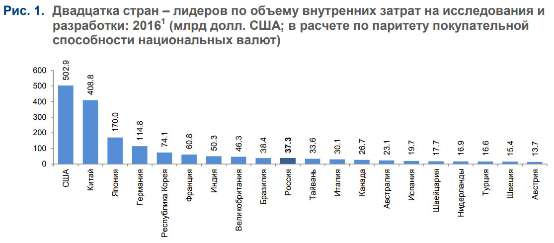 Согласно исследованию ВШЭ, объем внутреннего финансирования научных исследований и разработок в России за 2016 год составил 943.8 млрд руб.На первом месте списка - США, выделившие на науку в прошлом году 502,9 млрд долларов (в 13,5 раз больше, чем Россия), на втором - Китай с 408,8 млрд долларов (в 11 ...