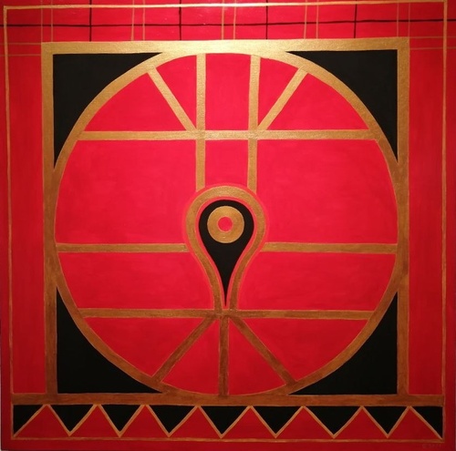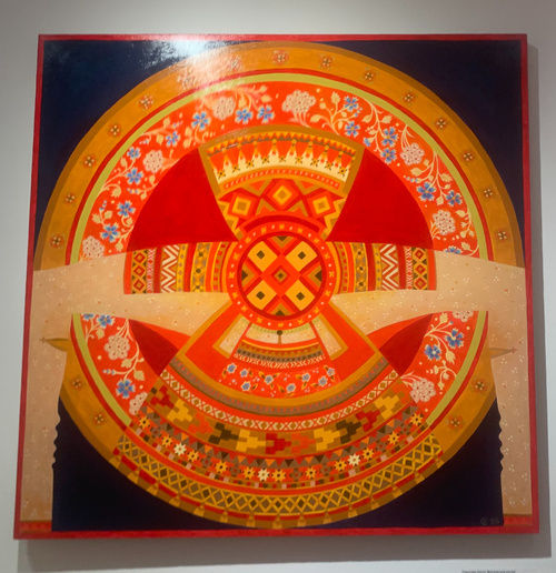 Впрочем, у Ольги не только парафразы на тему народного костюма. Ее художественные исследования привели к философским диалогам с добром и злом, к обращению к стихии Земли или Огня и даже к воплощению «Меры времени», когда «…В центре – Солнце, под ним Рождественская звезда. На синем фоне звезды и снег. Золотой луч слева внизу – мера Времени, смещающая всё плохое. Стрелочки на тонком синем обруче – движение по кругу,, они обозначают его цикличность». Художник к каждой картине написала лаконичное, всем понятное объяснение – и это дорогого стоит.