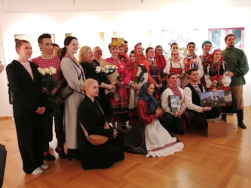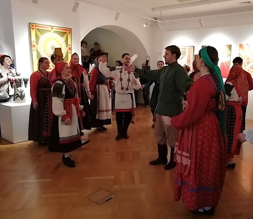 На церемонии открытия выставки всех поразило выступление народного хора Российской академии музыки имени Гнесиных (художественный руководитель – заслуженная артистка РФ, профессор Светлана Игнатьева). Вышли ребята и девчата в аутентичных костюмах. Современное прочтение фольклорного материала и свежие чистые голоса сделали свое дело. Перефразируя известные слова, сказать можно было лишь одно: и какой же русский не любит… традиционную народную песенную культуру! Хористы выглядели как будто сошедшие с полотен Ольги Соколовой, яркие, настоящие, из народа, как будто безмолвные матры запели и завели хороводы.