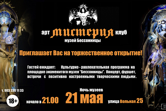 Союз Женских Сил ждет всех любителей неординарного творчества Леонтия Озерникова на церемонию открытия арт-клуба «МИСТЕРИЯ» 21 мая в 21.00 по адресу: ул. Вольная, 25