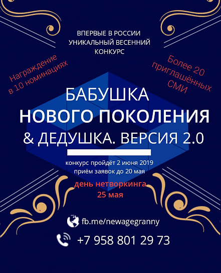 От организаторов известных российских и международных конкурсов. Впервые в России новый формат конкурсов талантов и красоты, который разрушает старые шаблоны восприятия слов «бабушка» и «дедушка» - уникальный весенний совместный конкурс «Бабушка нового поколения» и «Дедушка. Версия 2.0».